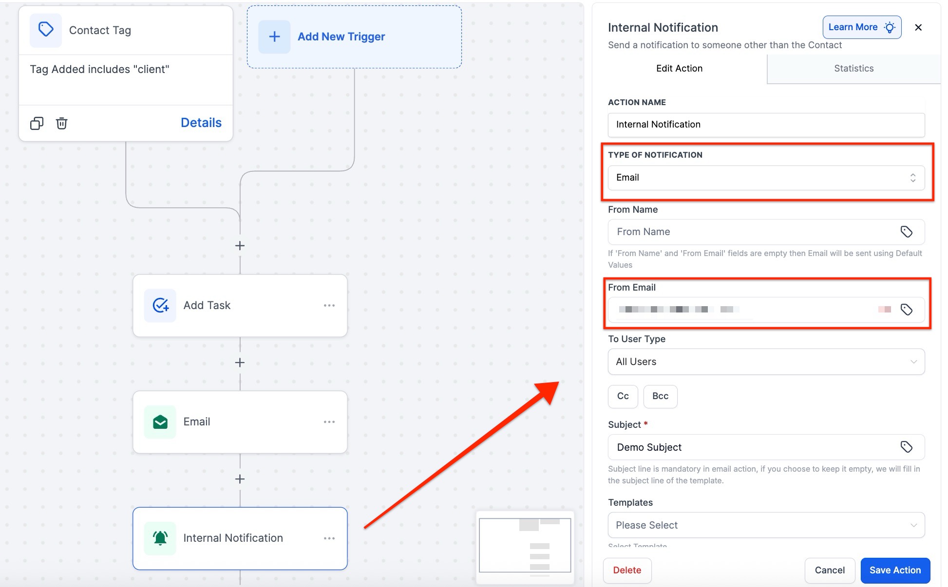 - In the “Send Internal Notification” menu, select “Email” under “Type of Notification.”