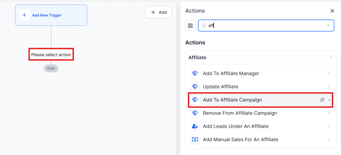 - Trigger Considerations: While you can set up this action with any Workflow Trigger, choose triggers that align with your campaign goals to ensure timely and relevant affiliate additions.