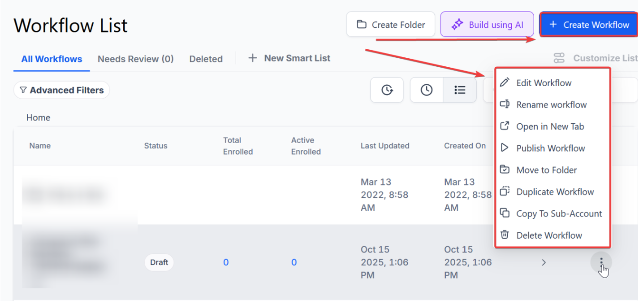 Section titled “Step 1: Start a new workflow or edit an existing one.”- Navigate to Automation > Workflows and start a new workflow or edit an existing one.