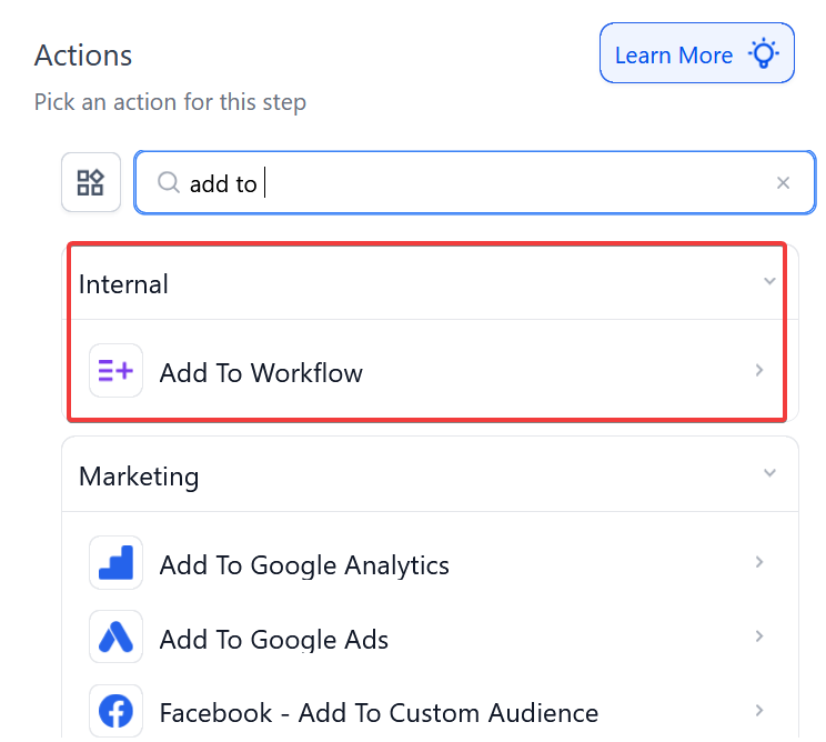 Section titled “Step-by-Step Guide to Setting Up the “Add to Workflow” Action”Step 1: Access Workflow Actions