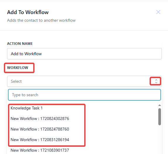 Section titled “Step 4: Select the Workflow”- Choose the workflow to which the contact will be added. Make sure to select the correct workflow that aligns with your intended automation.