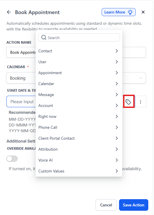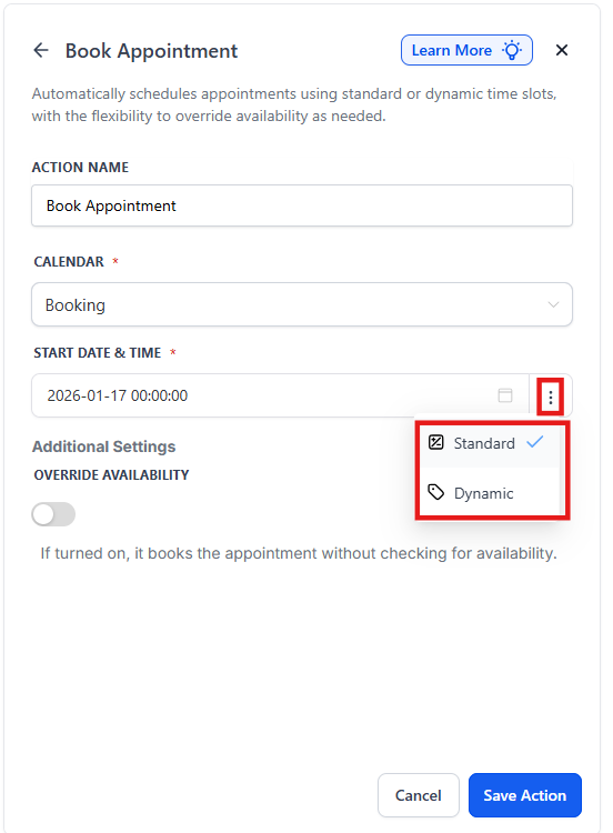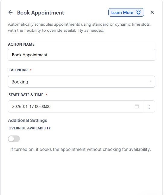 The Book Appointment workflow action allows users to automate appointment bookings seamlessly, integrating dynamic and standard scheduling options. This feature brings flexibility, enabling businesses to handle appointments more effectively by dynamically assigning time slots, overriding availability, and responding to booking statuses.