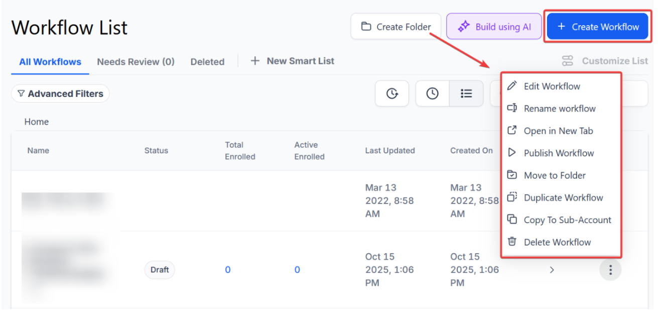 Section titled “Step 1: Start a new workflow or edit an existing one”- Navigate to Automation on the left > Workflows on the top and create a new workflow or edit an existing one
