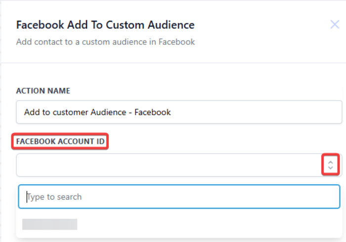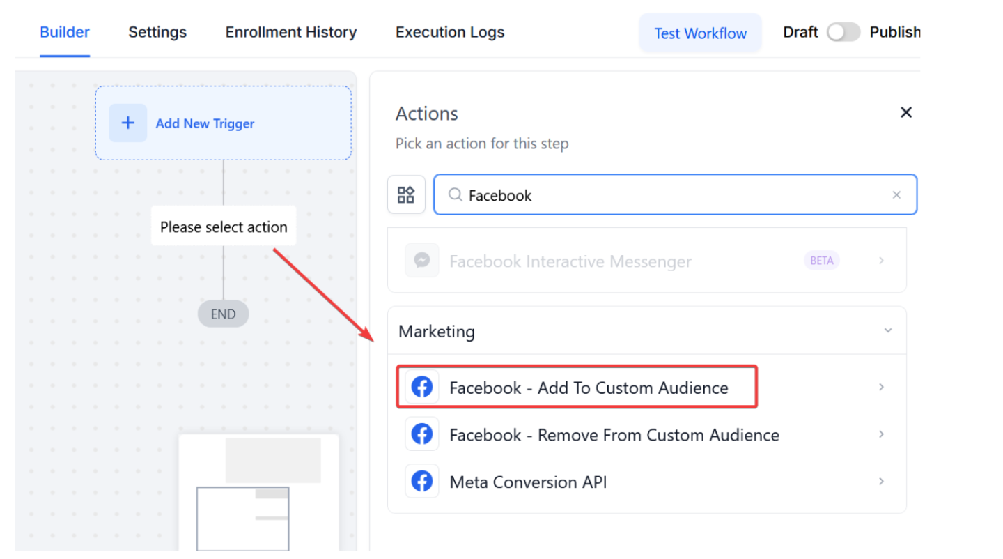 - Under Actions, select Facebook - Add To Custom Audience in the Actions section, or use the search feature. Upon selection, the Action setup menu will appear