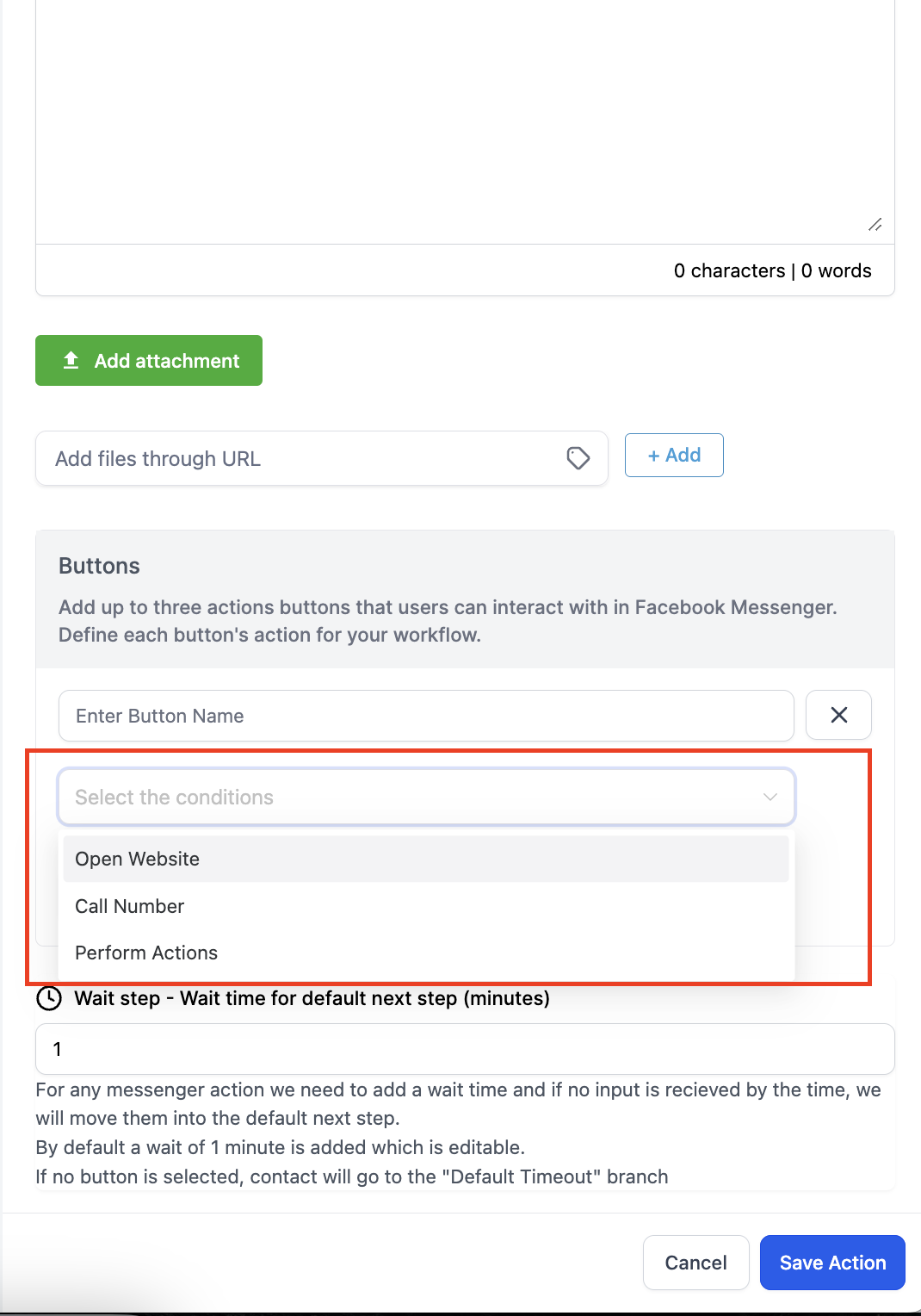 - A maximum of three buttons can be added to the Interactive Messenger action.