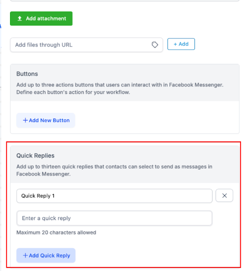 Note: In this Facebook Interactive Messenger action, you can add Buttons, Quick Replies, and Files alongside each other in one action. In the Instagram Interactive Messenger you can either add buttons or Quick Replies in a message. Quick Replies can only be added when no attachments are included in the same message.