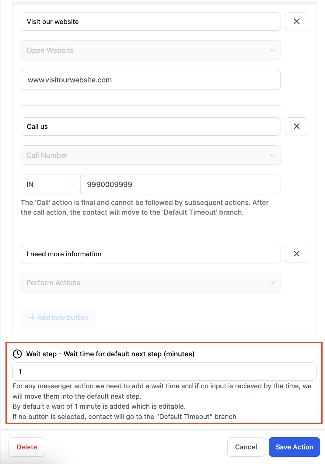 - Set Default Wait Time: Specify a default wait time before the contact moves to the default branch. This ensures a seamless flow of communication.