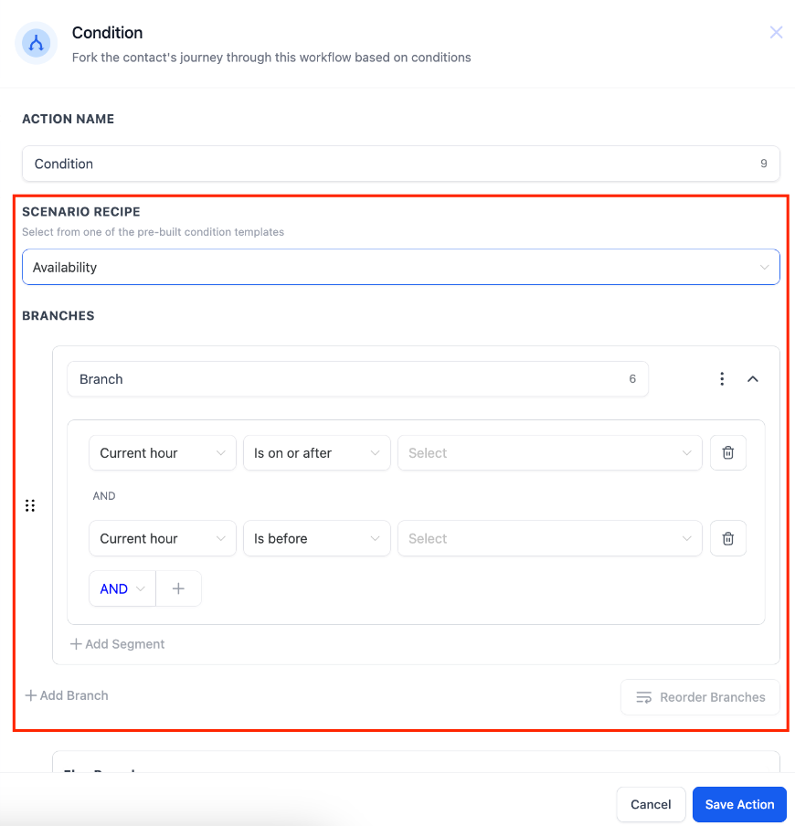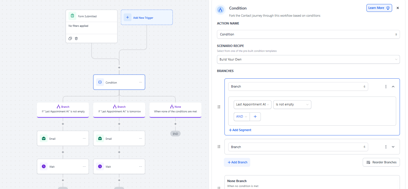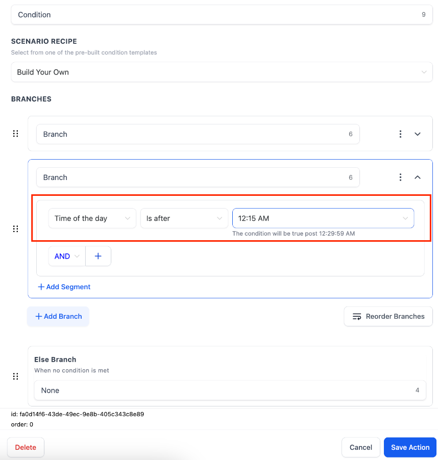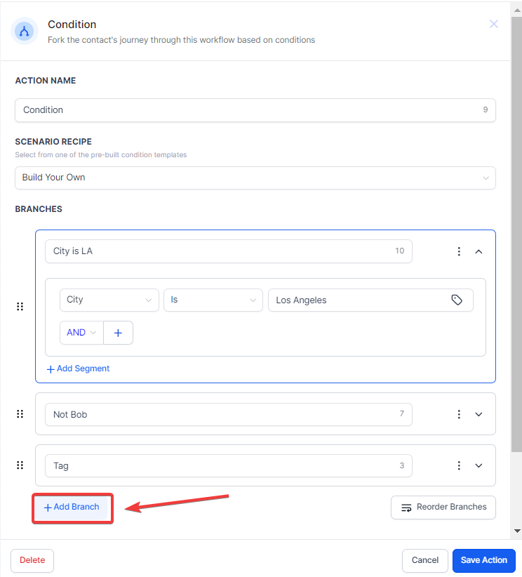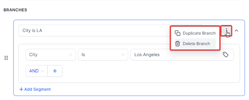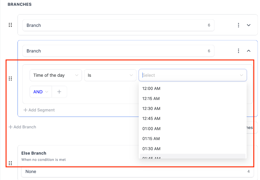 - To use branches, click on add branch and fill out conditions and segments as needed.