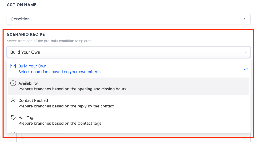 Section titled “Key Features and Benefits”- Scenario RecipesScenario Recipes are pre-built templates designed to simplify setting up If/Else conditions within your automation workflows. Whether you’re looking to branch based on customer interactions, behaviors, or other criteria, these recipes provide a quick and easy starting point.