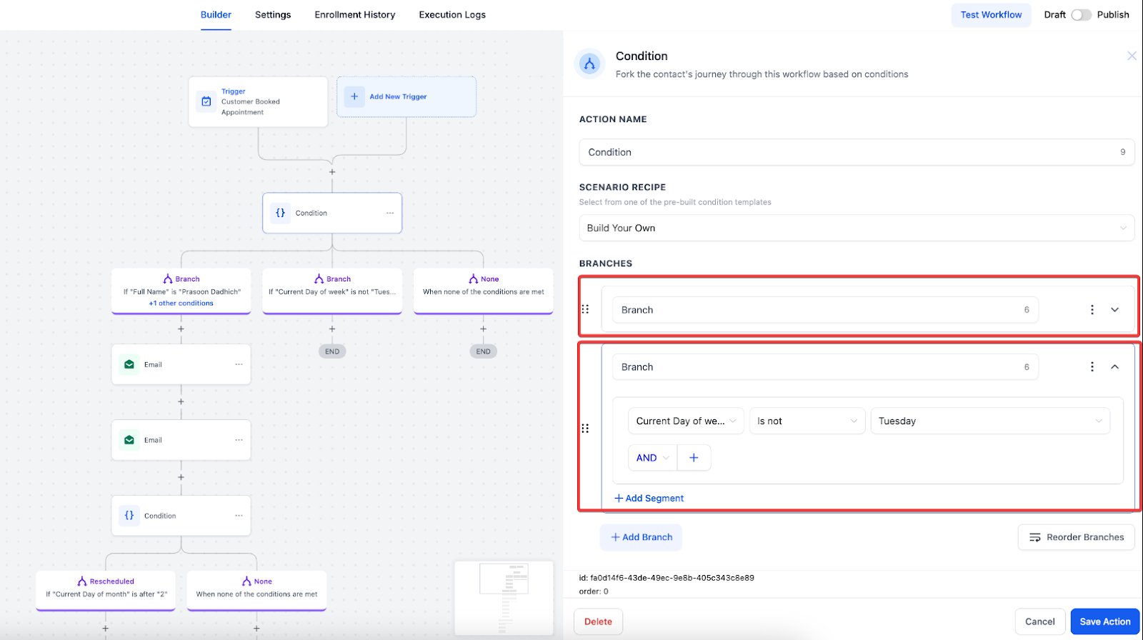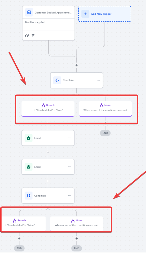 Organize workflow branches based on conditions, such as whether an appointment was rescheduled.