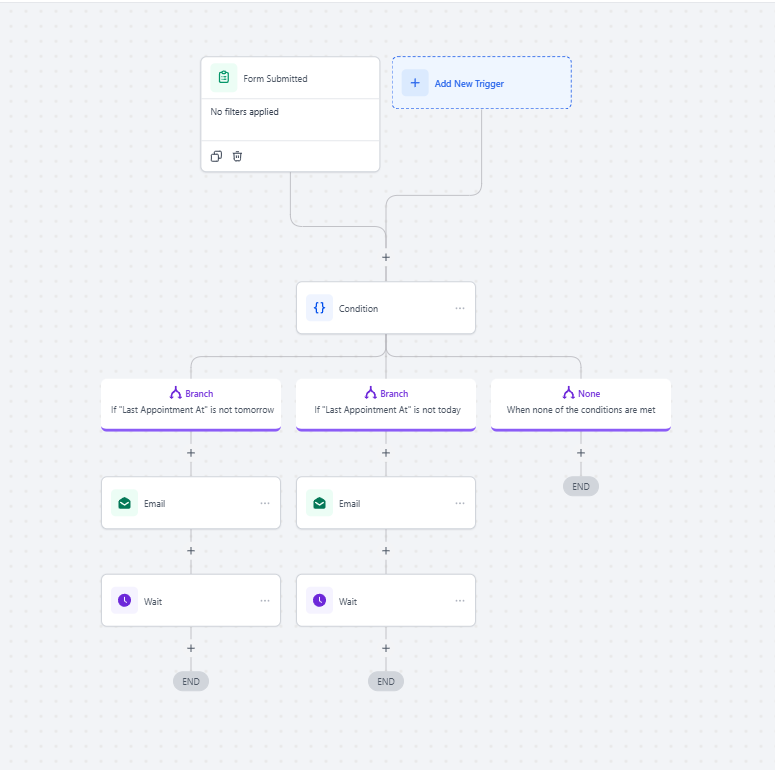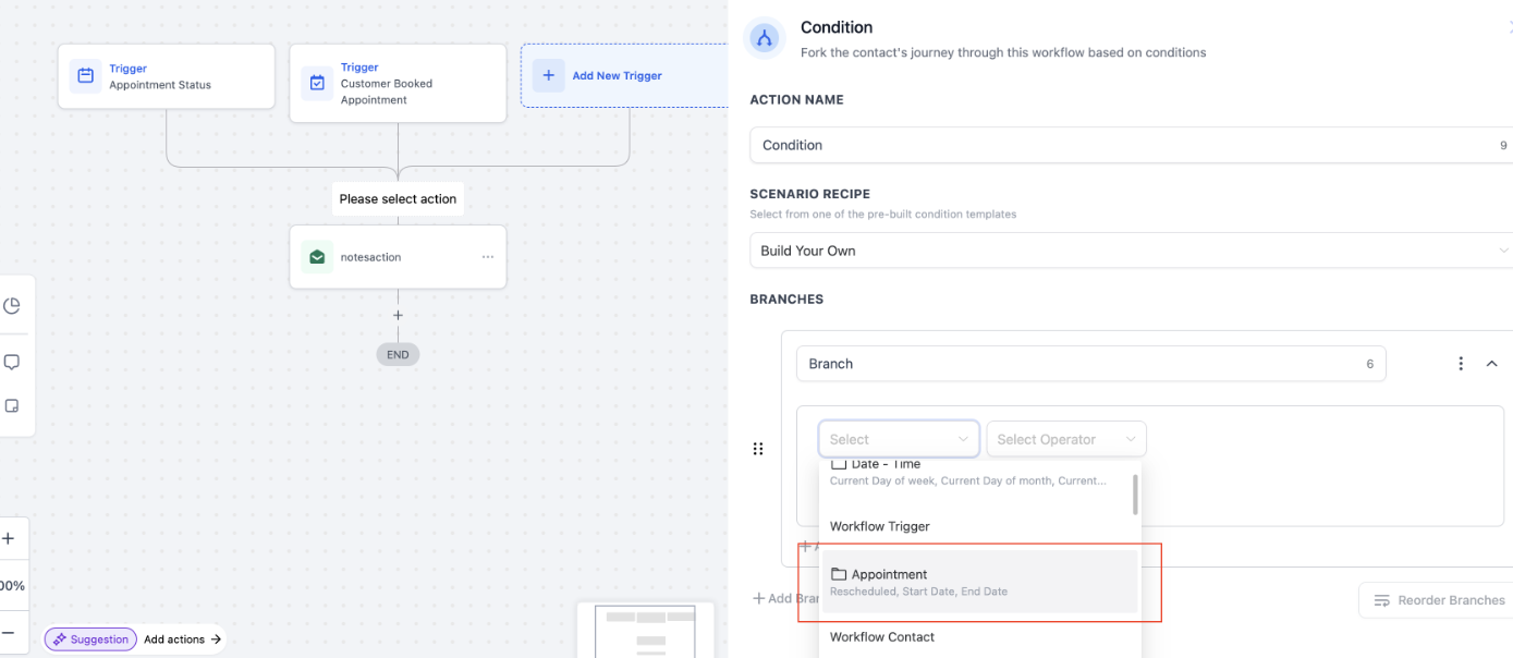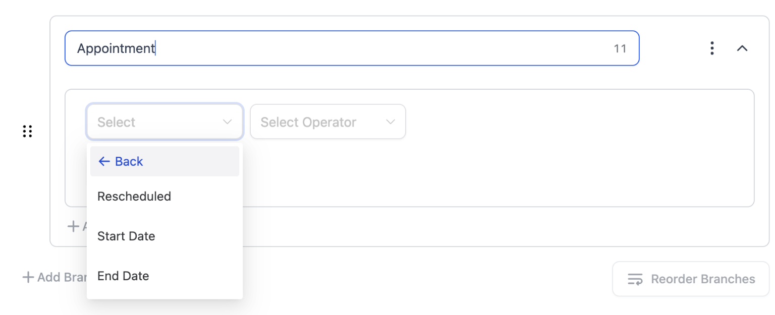 - Select “Appointment” in the If-Else branch dropdown and choose between Appointment Rescheduled, Start Date, or End Date.