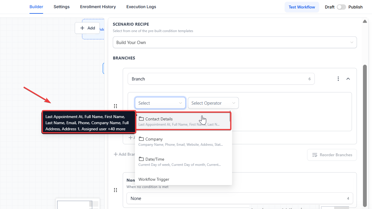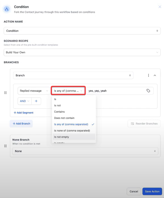 Question: What should I do if none of the conditions are met? Answer: Use the “None” branch option to handle scenarios where no conditions match. This branch can be used to ensure that contacts are still processed even if they do not fit the specified criteria.