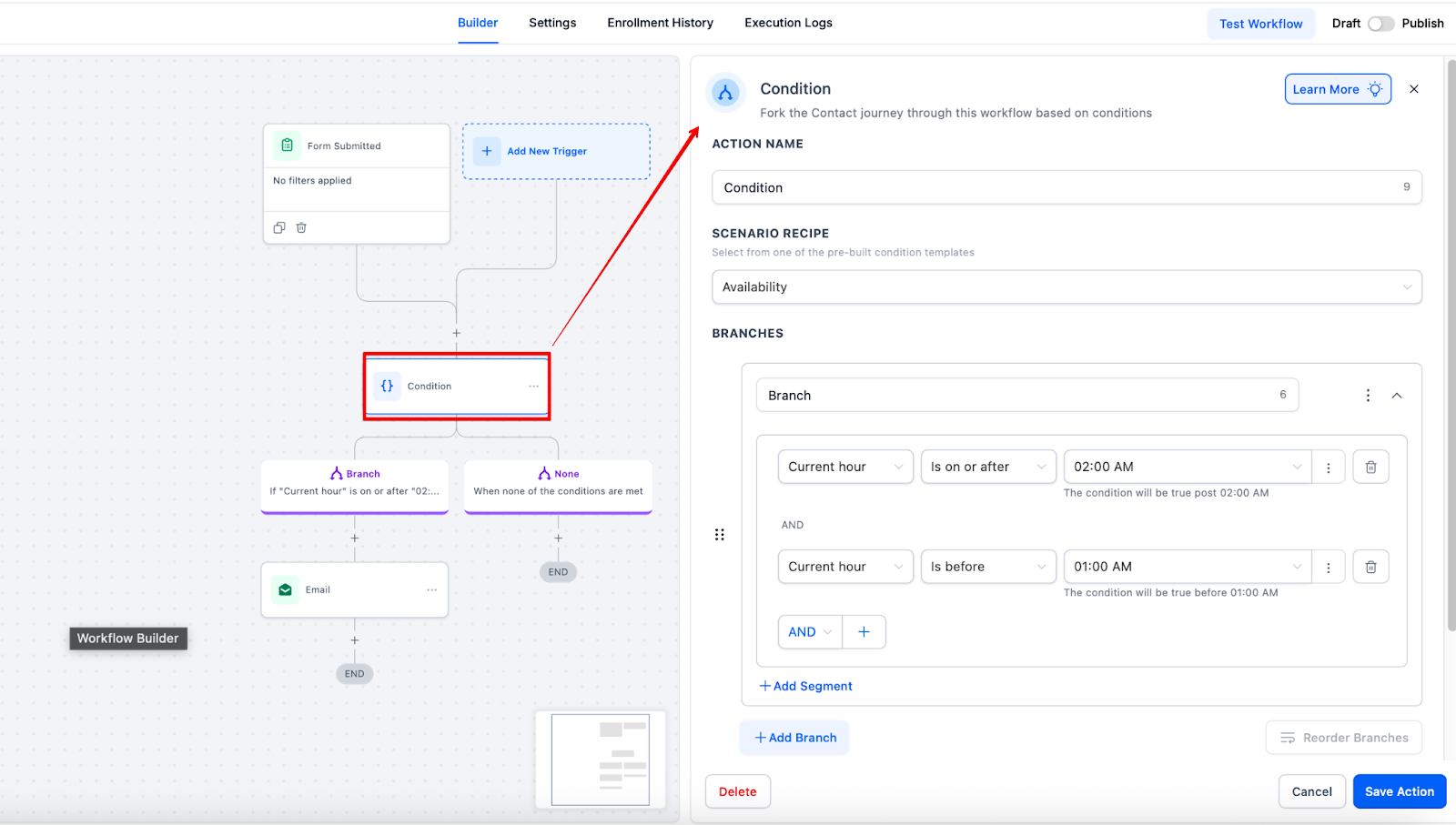 Question: Can I set time-based conditions? Answer: Yes. The “Time of the Day” condition allows granular control, letting you trigger workflow paths at specific times down to 15-minute intervals.