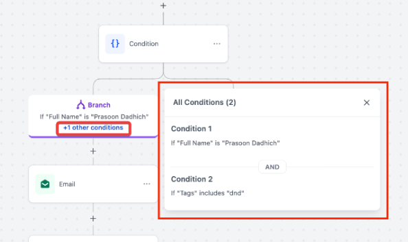- Detailed Condition View: For branches with multiple conditions, view them all in a pop-up by clicking on the “+x more conditions” button.