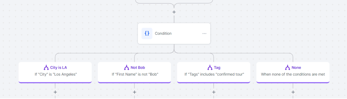 - Add one or more segments and operators, and choose from the dropdowns to customize the action. (In the Image above, I set the condition so anyone with “Los Angeles” as their City, and anyone without the name Bob, would go down 1 path of the workflow. Anyone else would go down the 2nd path.)