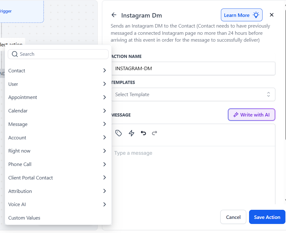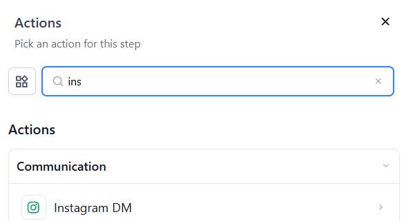 - Under Actions, select Instagram DM in the External Communications section of the Actions Menu or use the search feature. Upon selection, the Action setup menu will appear