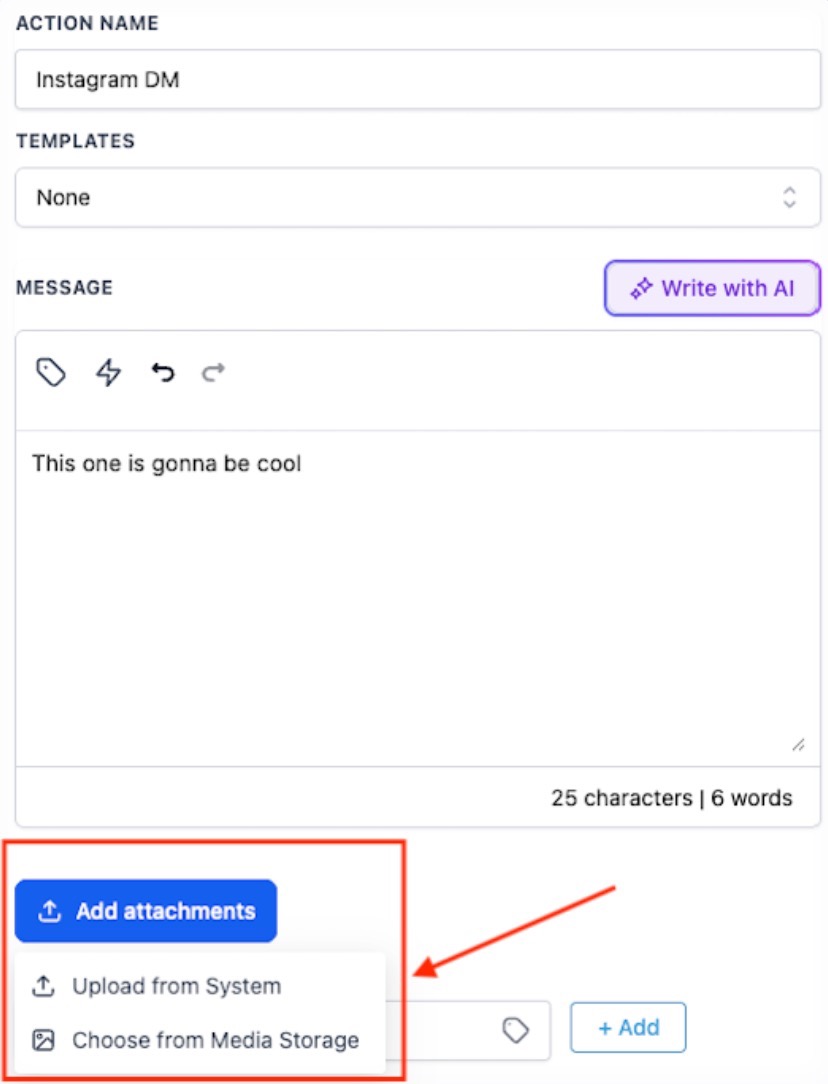 Section titled “Step 4: Adding Attachments”You can attach files directly to your Instagram DM action using two convenient methods. When you click Add Attachment, a modal will appear with the following options: