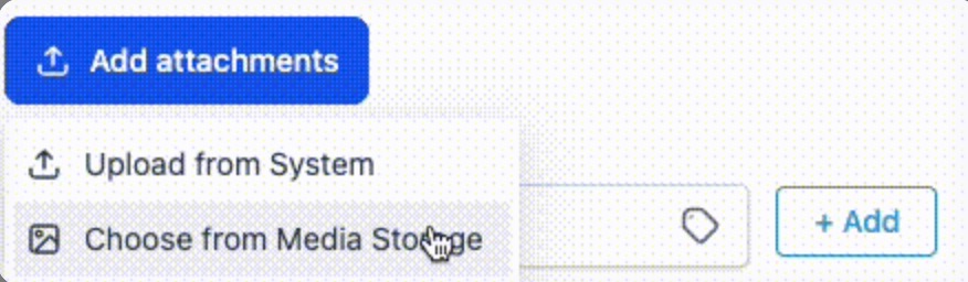 - Choose from Media Storage: Select an existing asset already saved within your Media Library. This allows you to reuse approved assets (like PDF guides or promotional images) across multiple workflows without needing to re-upload them each time.