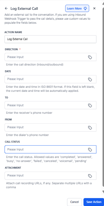 - Configure the Action: Select the “Log External Call” action and pass relevant call details, including the call direction, phone numbers, and call recording (if available).