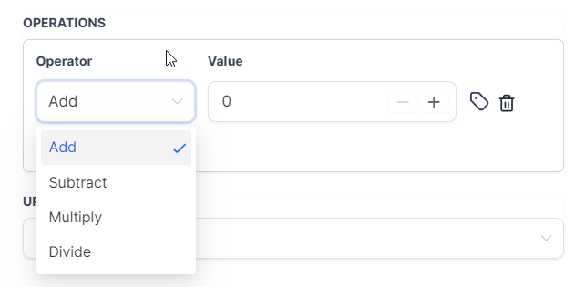 - Input a fixed number or use a custom field for the calculation. This value acts as the operator (e.g., adding 10 to a numeric field).