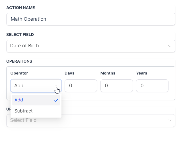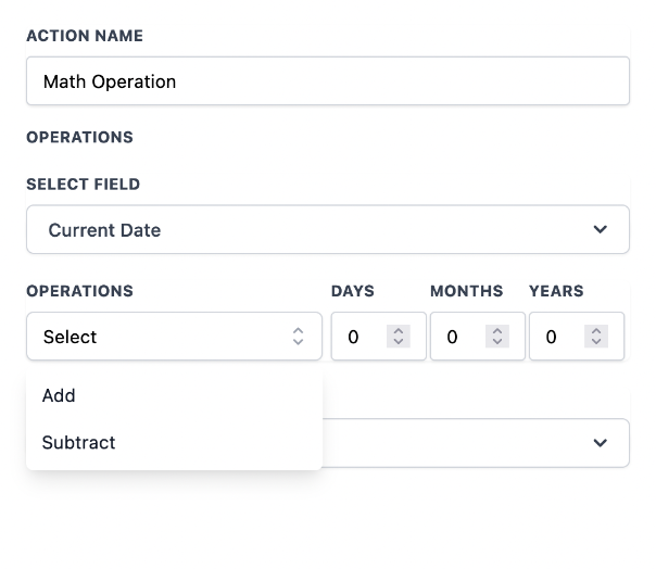 In workflows, the Math Operation action can be used with date fields, enabling the manipulation and calculation of dates by adding or subtracting specific time units. This feature automates time-sensitive tasks and schedules based on dynamic dates. Below are details about the date field types and the supported math operations: