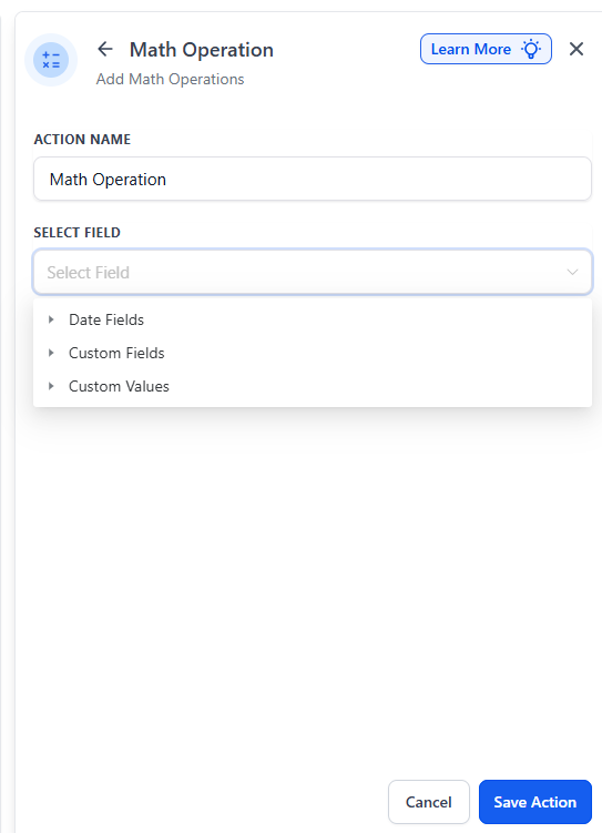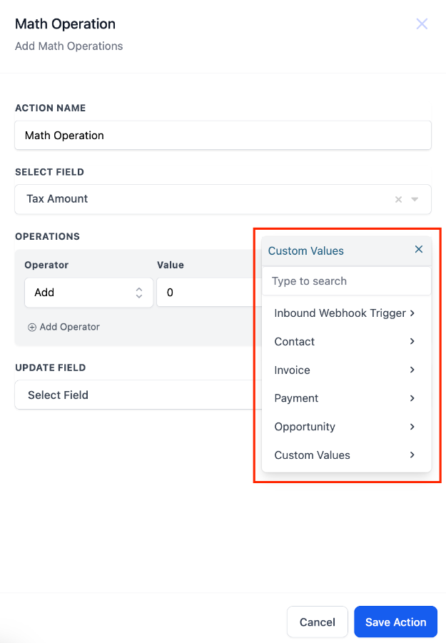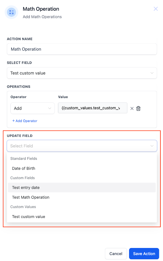 Users can update custom values directly within the Math Operation action, including Standard Fields and Custom Fields. They can also perform operations on custom values and adjust them in real-time, further improving workflow automation.