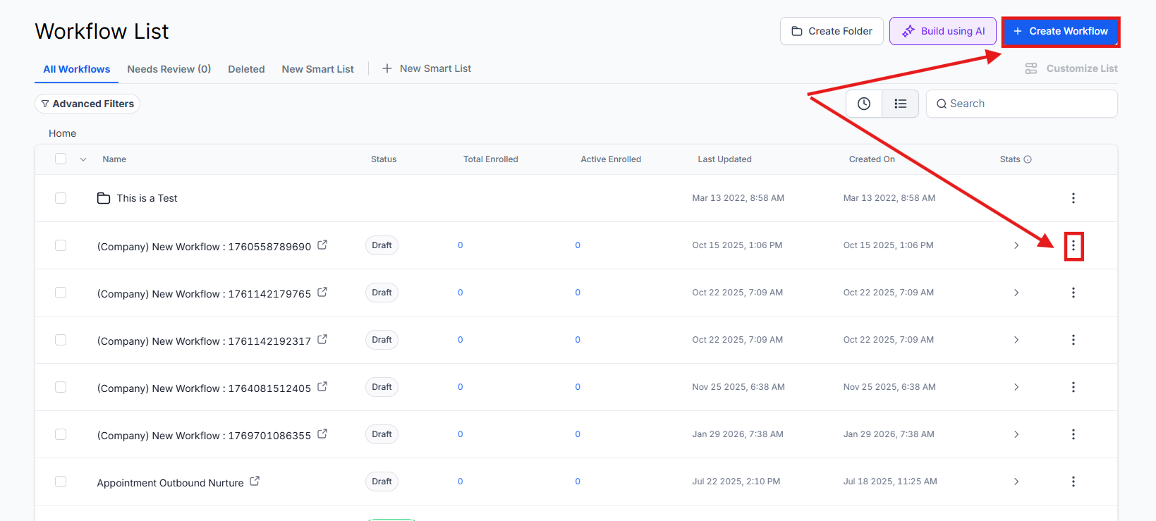 - To create a new automation or edit an existing one, click on the Workflow Name.