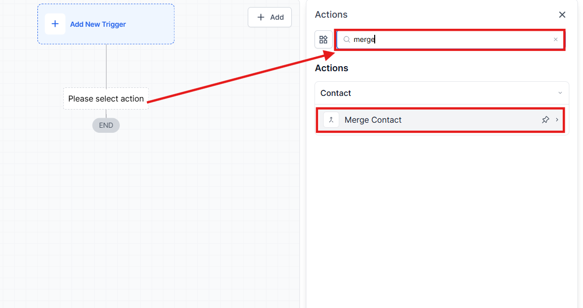4. To locate the tool, type “Merge Contact” in the search bar or find it under the contact actions list and click Merge Contact.