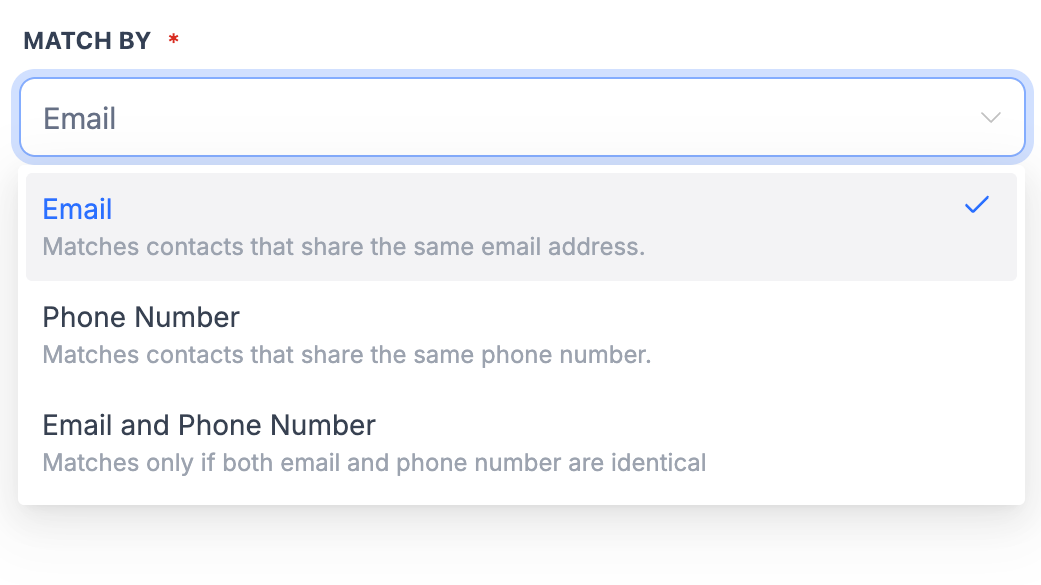 5. To define how the system finds duplicates, go to the Match By dropdown menu and select one of the following:
