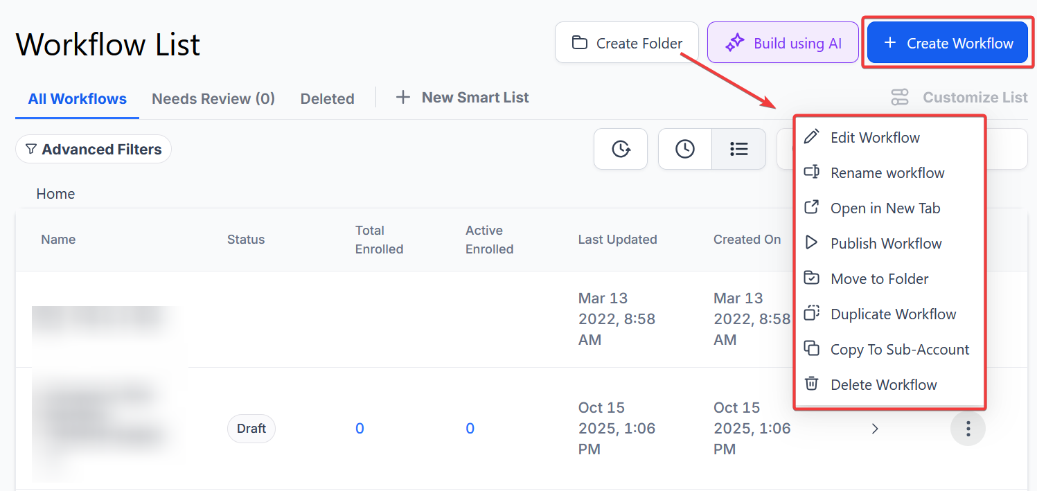 Section titled “Step 1: Start a new workflow or edit an existing one”- Navigate to Automation on the left > Workflows at the top and create a new workflow or edit an existing one.