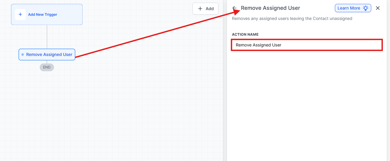 Question: How do I add the Remove Assigned User action to my workflow? Answer: Click the “+” symbol below the trigger in your Workflow builder. From the Actions Menu, select “Remove Assigned User” in the Actions section or use the search feature to locate it. The Action Setup menu will appear for configuration.