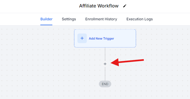 Section titled “Step 3: Setting up the Remove From Affiliate Campaign Action”- Click on the “+” symbol below the trigger to add an action.