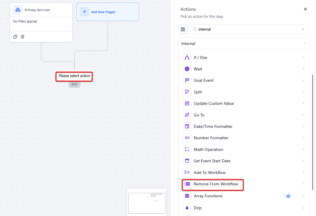 The Remove Workflows Action enables users to automatically remove contacts from one or multiple workflows. This article will give you an overview of how to create a workflow using the Remove From Workflow Workflow Action.
