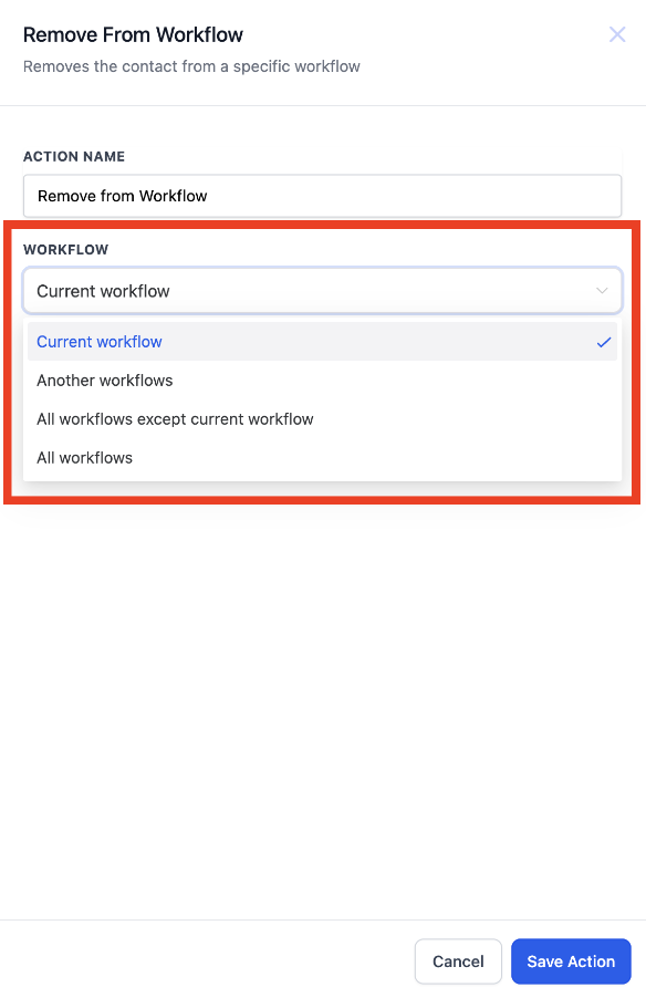 Section titled “FAQs: Remove From Workflow Action”Question: What does the Remove From Workflow action do? Answer: This action removes a contact from either the current workflow they are in or another specified workflow. It helps in managing a contact’s engagement across different workflows.