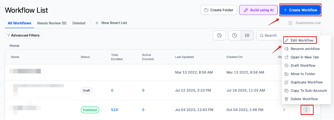 - Navigate to Automation on the left > Workflows at the top and choose to create a new workflow or edit an existing one.