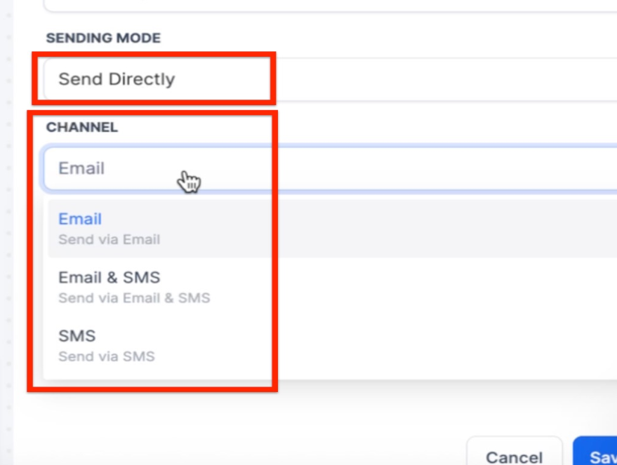 When you select “Send Directly,” you will see the option: “Channel” with 3 options: Email, SMS, or both.
