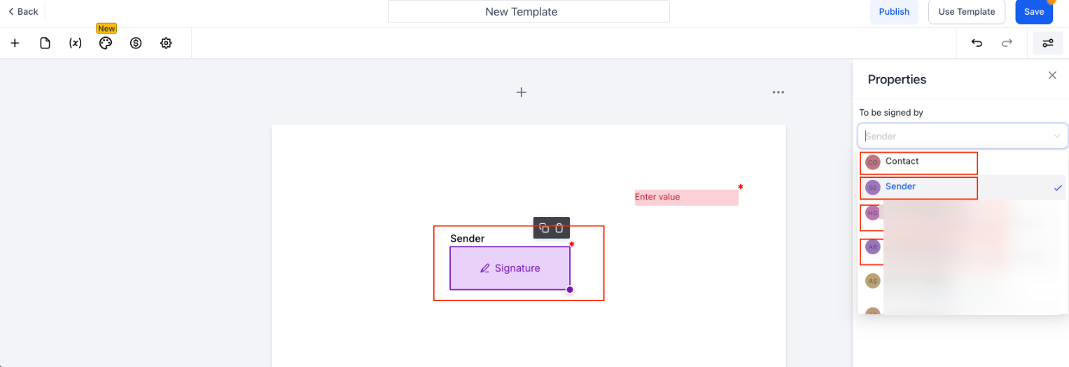 Note: You can link fillable fields in your Documents & Contracts templates directly to the Workflow ‘From user’. For that, Create a Template with Sender Field in Payments > Documents & Contacts > Templates. Open the template editor by clicking New. Add a Signature (or any fillable field) and set “To be signed by” to Sender. Save the template.
