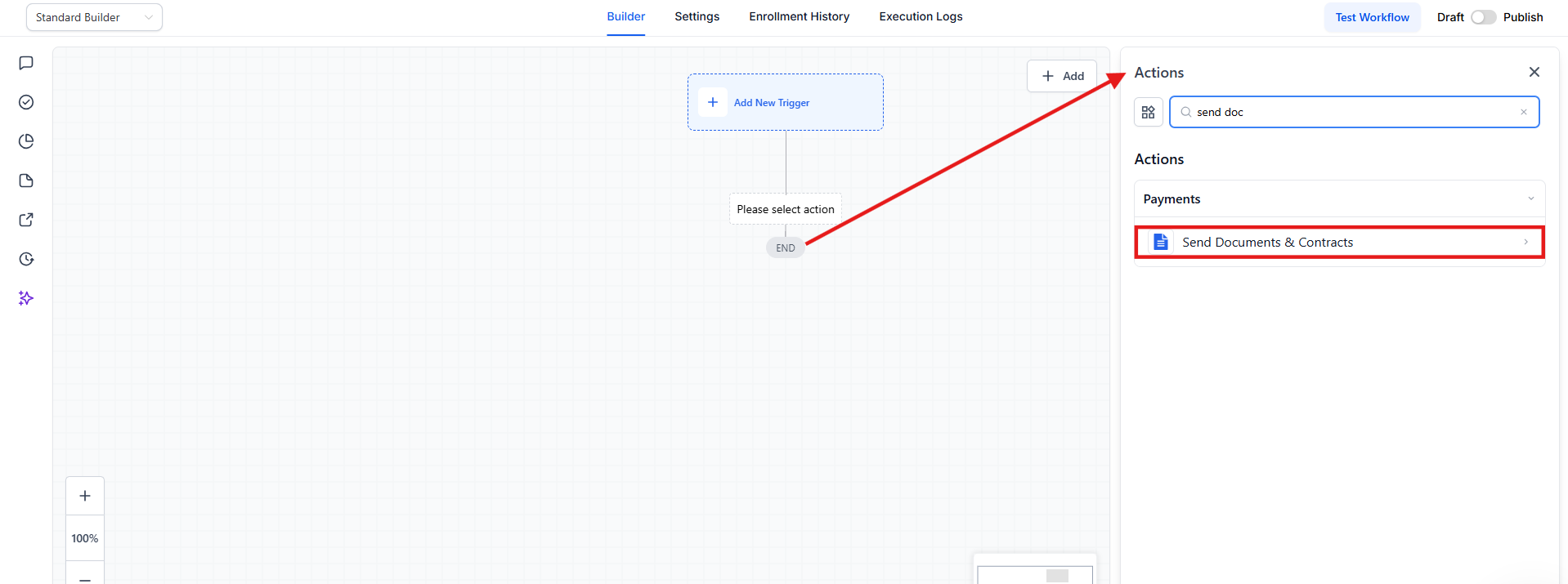 - In the workflow editor, add the action “Send Documents & Contracts.”