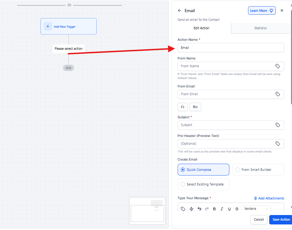 - Cc/bcc in Email Action: This allows users to add CC and BCC fields in the Email Action, providing more flexibility in email distribution. The communication enables users to send copies of emails to additional recipients without modifying the main recipient’s information. You can include multiple CC/BCC emails, separated by commas, for streamlined communication.