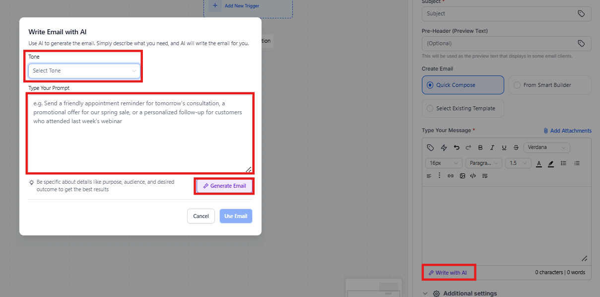 Email Action AI leverages AI to create context-aware, conversion-optimized emails, eliminating the need for manual writing or external copywriting tools. Describe the email’s purpose, choose a tone (optional), and generate your message. Note: The email subject line is optional, and AI-generated content can be revised with follow-up prompts before implementation.