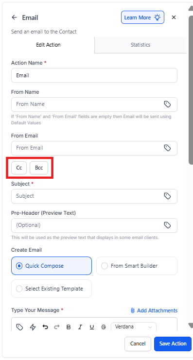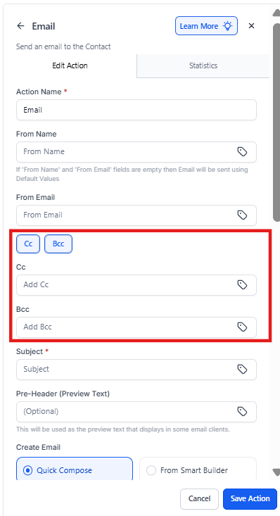Please note: CC and BCC emails will not be reflected in the email statistics, and the Test Email action will not function for CC/BCC emails.