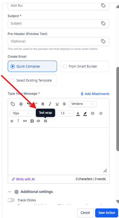 Question: How can I prevent my emails from looking “broken” or losing line breaks when I copy and paste content from other external editors? Answer: You should use the Text-Wrap Tool icon located in the Send Email action. This feature ensures that line breaks are preserved and the email remains responsive across all devices—specifically solving formatting issues that occur on Outlook mobile.