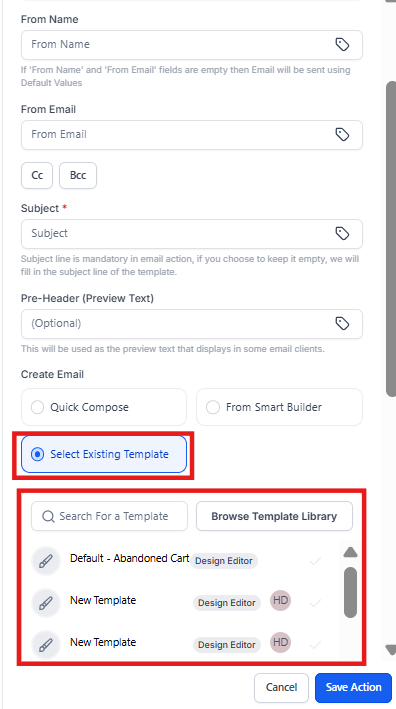 To use this feature, navigate to Workflows, open the Email Action, choose a template from the dropdown, click on the Edit option on the thumbnail, make the required edits, and then select “Save as New Template.”