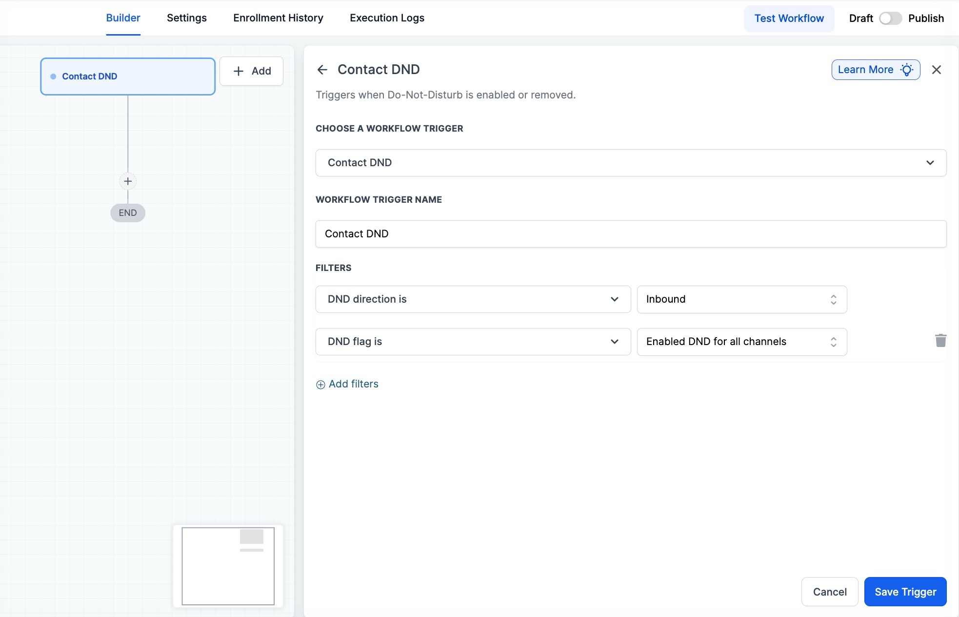 - Determine the workflow where you want to use the Set Contact DND action. Ensure that it fits scenarios like handling opt-outs or managing bounce-backs.