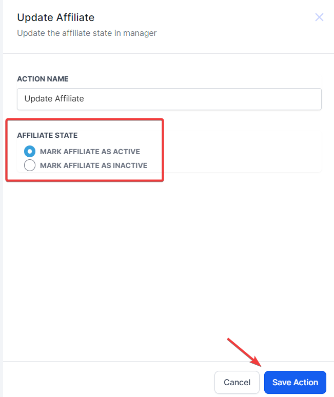Answer: When setting up the Update Affiliate action, you can specifically choose whether to mark an affiliate as “active” or “inactive” to ensure your affiliate data stays current.