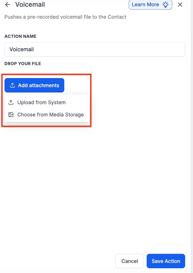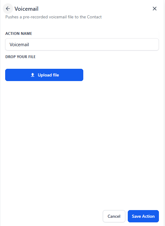 Question: What types of files can I upload for the voicemail action? Answer: You should upload audio files in formats commonly accepted for voicemails, such as MP3. Ensure the file is clear and properly recorded for best results.
