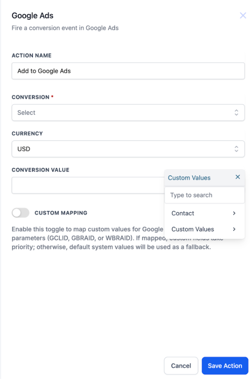 - Under Conversion select which conversion event you want this action to fire for your Google Ads.