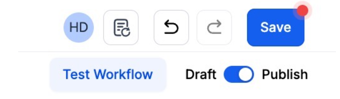 Section titled “Step 4: Press Save in the top right corner of your browser to save the workflow”- If your Workflow is ready to be enabled, make sure the toggle switch under Save is set to Publish
