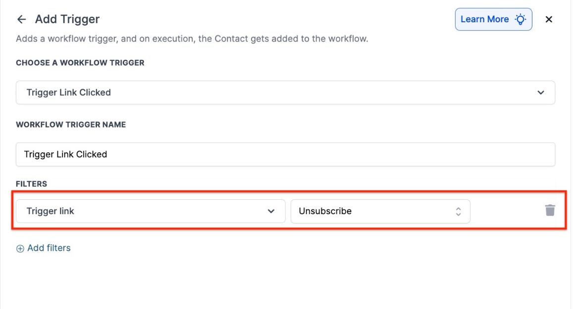 - Add a Workflow Trigger: Trigger Link Clicked. You will need to define the filter to the specific trigger link you created as the Unsubscribe link so it fires off the action only for that particular trigger link.