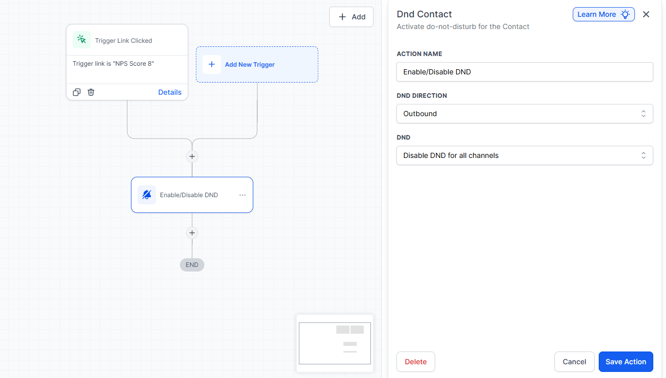 - For the first action, click the + and add ‘Set contact DND.’ Then, you will select ‘enable contact DND’ from the dropdown menu.